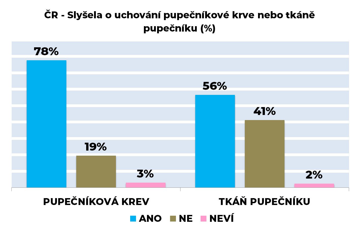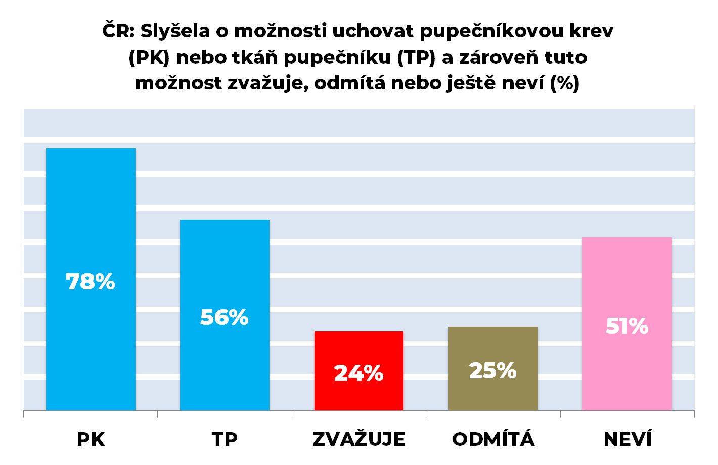 Na otázku, zda maminka slyšela o možnostech uchovat pupečníkovou krev (PK) pro využití při léčbě jejího dítěte, odpovědělo kladně 78 % oslovených, 19 % se vyjádřilo záporně. Na stejnou otázku týkající se tkáně pupečníku (TP), odpovědělo kladně 57 %, 41 % se vyjádřilo záporně. Pouze 2-3 % odpovídalo, že neví.