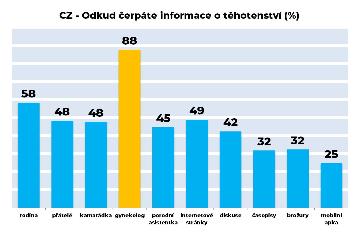 Hlavní důvěryhodný zdroj, odkud maminky přijímají informace v průběhu těhotenství, je v ČR gynekolog (88 %), daleko za ním je rodina (59 %) a ostatní zdroje.