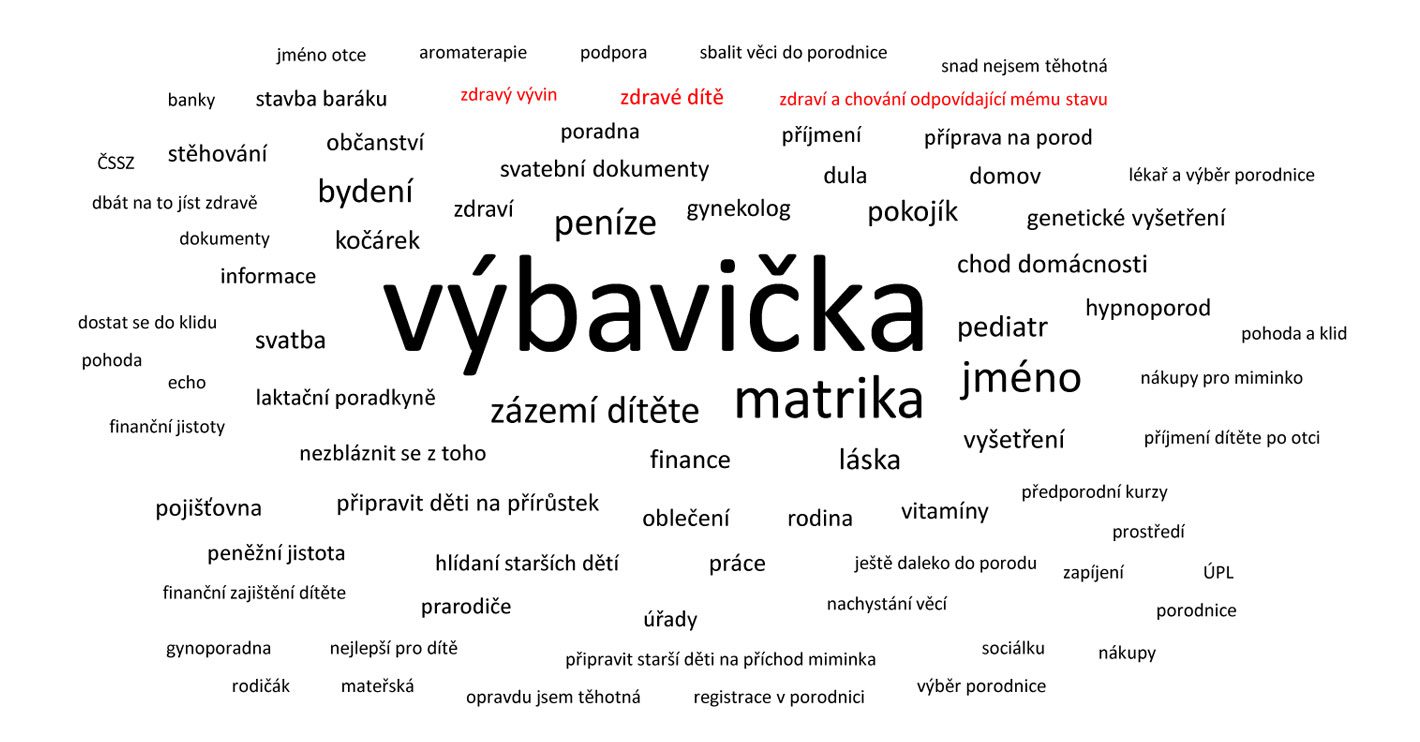 Z odpovědí je vidět, jaký nastává posun ve vnímání priorit během těhotenství. Navzdory tomu, že maminky kladou během těhotenství zdraví dítěte na první místo (klíčová priorita ve druhém a třetím trimestru je zdraví miminka), první myšlenky, když zjistí že jsou těhotné, se ubírají zcela jiným směrem (například obstarání výbavy pro miminko – přes 50 % nebo zařídit matriku 30 %). Priority se v tomto ohledu neliší výrazně ani mezi prvorodičkami a druho či více rodičkami.