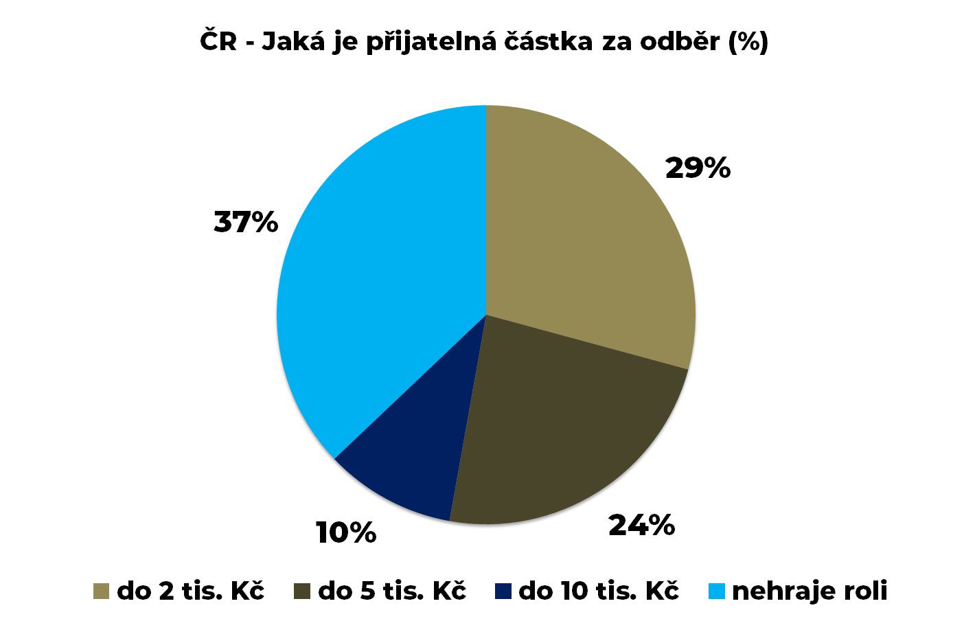 Pro více než třetinu (37 %) cena nehraje žádnou roli. Víceméně shodně je přijímána cena ve středu nabízených možností (5-10 tis. Kč). Přibližně třetina (29 %) by uvítala cenu na minimu (pod 2 tis.).